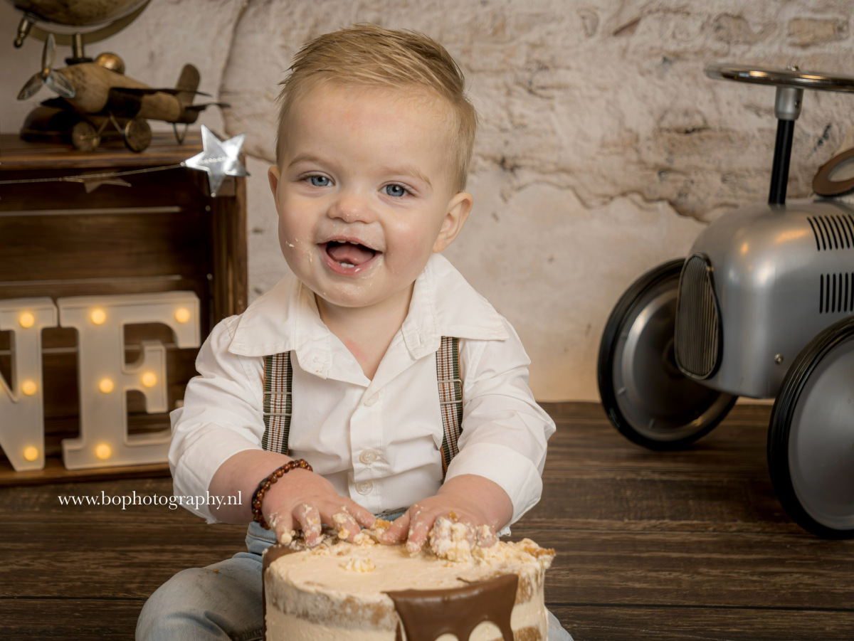 Lekker ontdekken en kliederen! Voor de cakesmash met een taartje gebruiken we een luchtige taart met boter crème, uiteraard passend bij het thema van de fotoshoot!